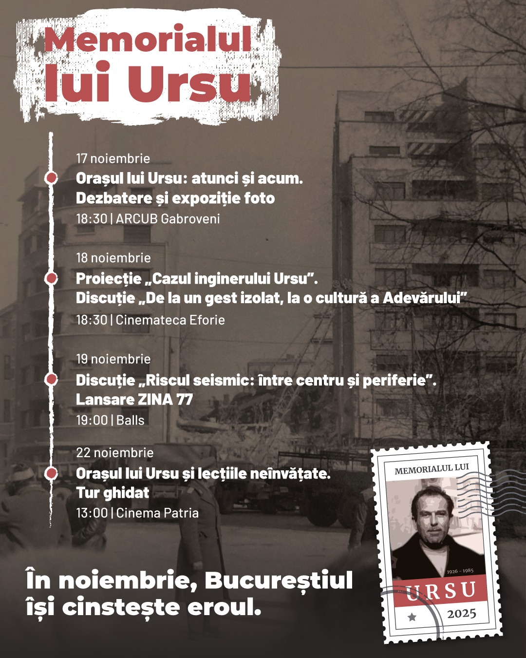 • pe 17 noiembrie, de la ora 18:30, la ARCUB Gabroveni, sub umbrela „Orașul lui Ursu atunci și acum”, va avea loc o dezbatere și expoziție foto. Discuțiile vor lega riscul asumat de dizidenți în trecut de riscurile remanente din orașul de astăzi.
